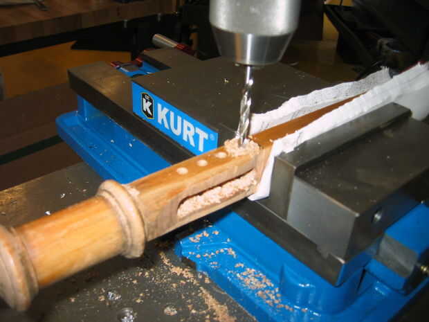 Les perfore a través de todo el camino. Utilice una broca afilada. Peck en el agujero para despejar las fichas y evitar quemar la madera. Coloque un bloque de madera contra la parte inferior y alimentos lentamente para evitar astillar un orificio de salida grande allí.