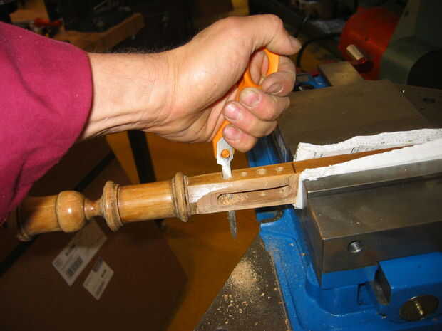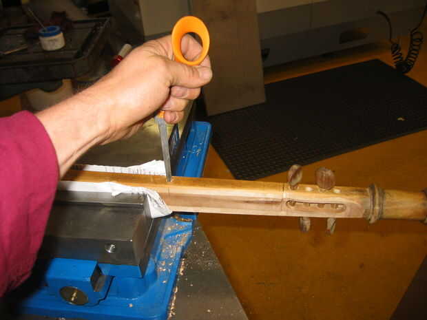 Taladrar y escariar el cuello para el agujero pulgar cadena peg. Taladro todo el camino a través de así que los chips pueden ir a algún lugar.