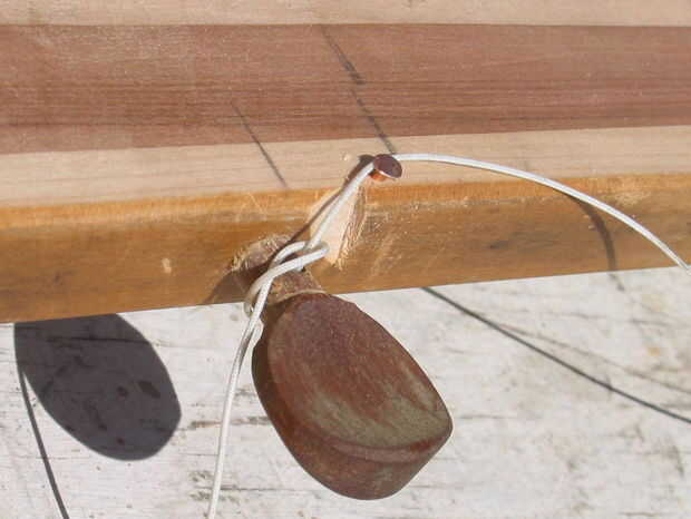 Aquí está la quinta clavija de cadena con la cadena atada a él con el nudo de lazo de la cerradura.