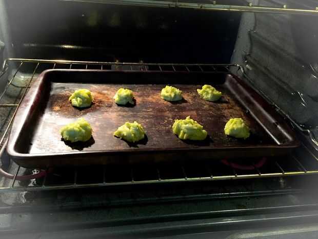 Durante unos 10 minutos, cueza al horno los en el horno precalentado hasta que las galletas empiezan a obtener el color marrón. Desde la vista de pájaro, las galletas ligeramente deberían verse verdes como aguacate. Si desea más color marrón puede dejas unos minutos más.