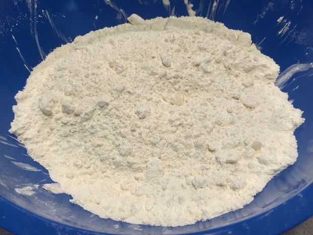 Usando un cortador de pastelería o un tenedor, cortar la mantequilla en la mezcla de harina hasta que la manteca de guisante de tamaño y completamente incorporado en el mixure de harina.