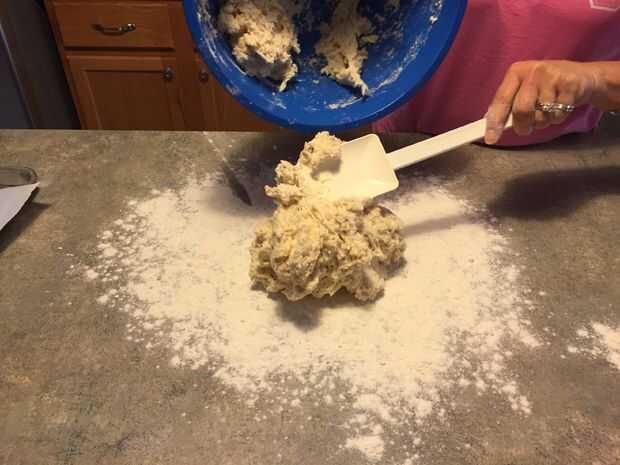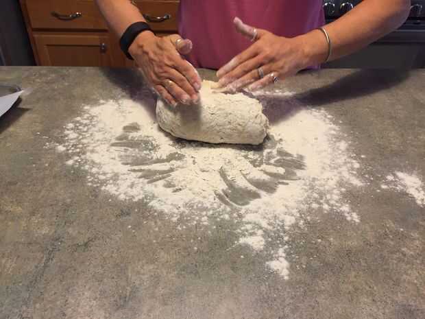 Ponga la masa hacia fuera en una superficie enharinada y amase 4 - 5 veces para unir la masa. Una de mis cosas favoritas es amasar. Yo lo llamo "jugando con mi comida".