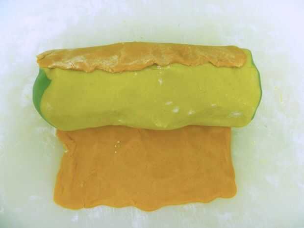 A continuación, sobre una tabla enharinada, estirar la masa azul en un rectángulo la longitud del registro de púrpura y lo suficientemente amplia para rodearlo. Coloque el registro de púrpura en la parte superior y el azul alrededor del rodillo.