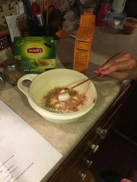 Sume la cantidad de meausred de harina, canela, bicarbonato, sal y polvo de hornear en un tazón por separado y se mezclan todos los ingredientes. Una vez mezclado añadir a otro recipiente y mezclar. Agregue las nueces, si lo desea. Acabado por mezclar contenido con la cuchara de madera o batidora eléctrica.