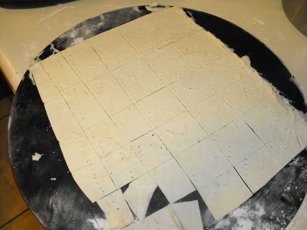 Corte cualquier exceso de la caída, poke agujeros con el tenedor y cortar la masa en cuadrados usando el cortador de pizza.