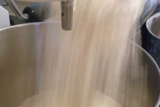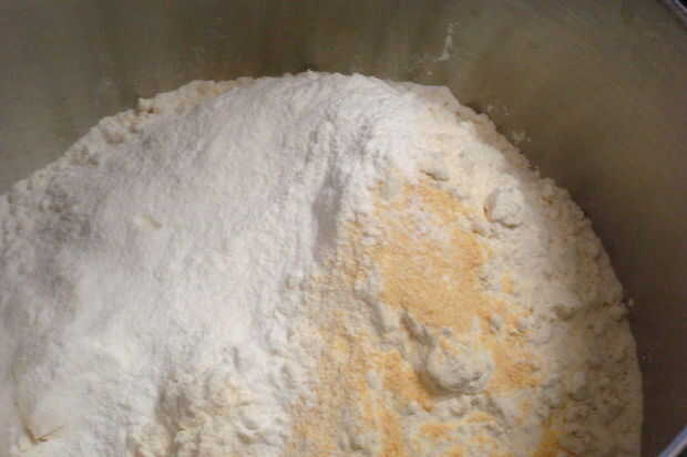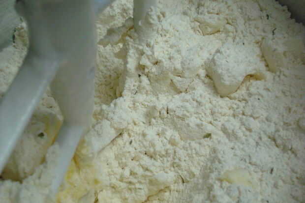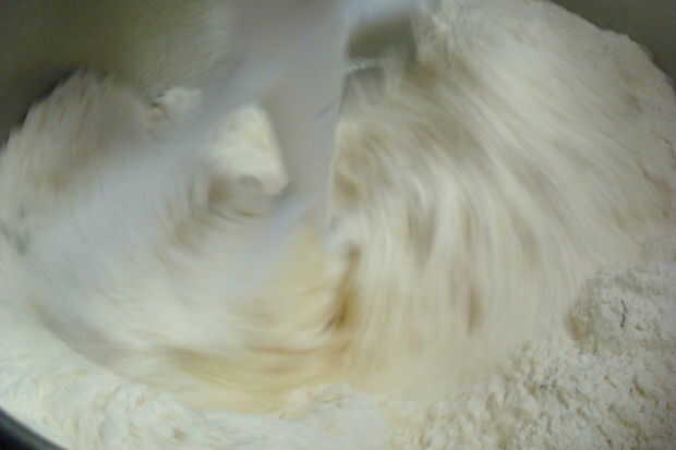 Después de poner la mantequilla blanda en el recipiente que necesita para añadir todos los ingredientes secos y mezclar hasta que la mantequilla se ha cortado en la harina uniformemente.
