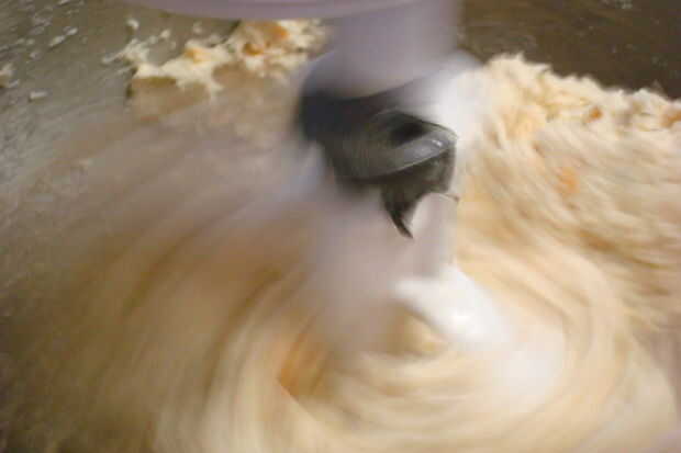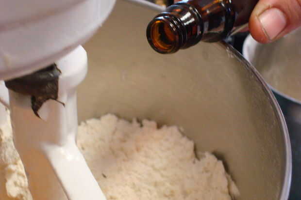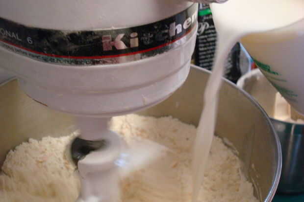 una vez que usted agregue el líquido que se necesita para amasar lo menos posible. Añada suficiente leche para llegar a una consistencia agradable y luego dejar de verter, dejar de amasar en cuanto esté listo. Luego tire de ella fuera de la vasija y en un mostrador enharinado.