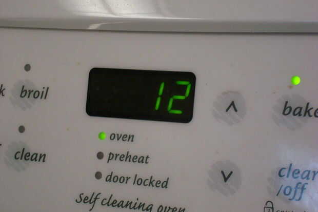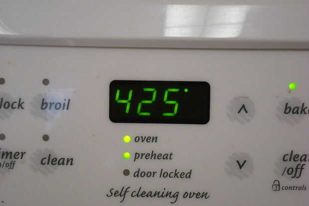 En el horno a 425 grados, 12 minutos. Cuando el tiempo está para arriba, tire hacia fuera, abrir una y marque el centro, si no es pastoso, bien.