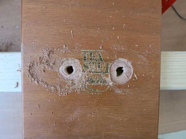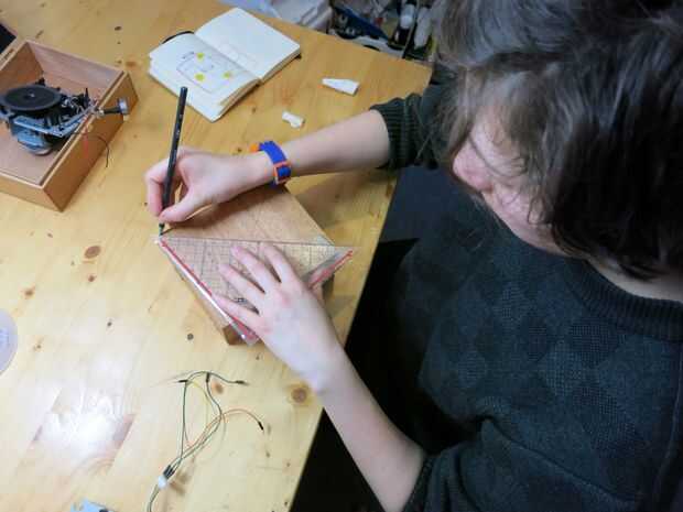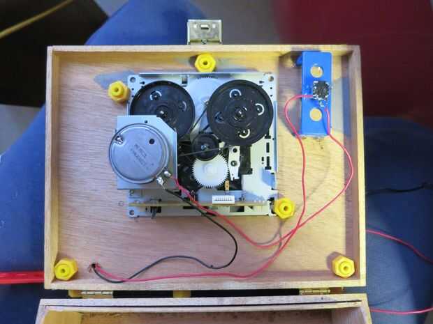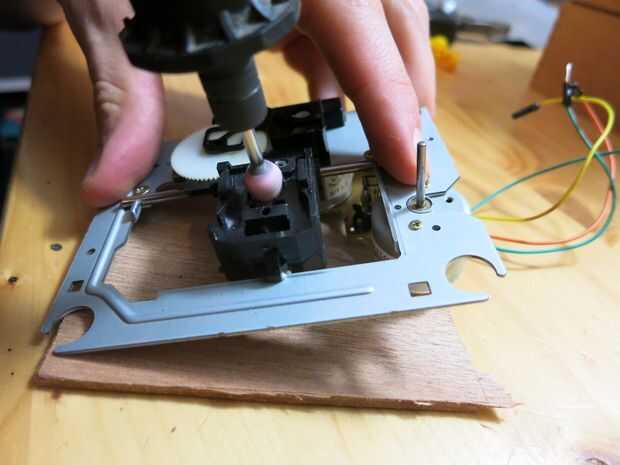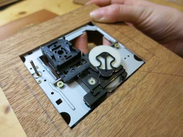 Lo primero para montar los componentes electrónicos en las dos cajas nos encontrará. Es mejor en el centro por lo que disponer de suficiente espacio. También ajustar el centro de la turner cookie con el mecanismo de la lente del CD como se muestra en las fotos. Así que coge un lápiz y dibujar el contorno de las piezas en las cajas de madera. No cortar en ese contorno pero 5mm interior para que tenga un margen para el mecanismo del tornillo. En este caso la madera era muy tierna así podríamos cortar con un cuchillo.
