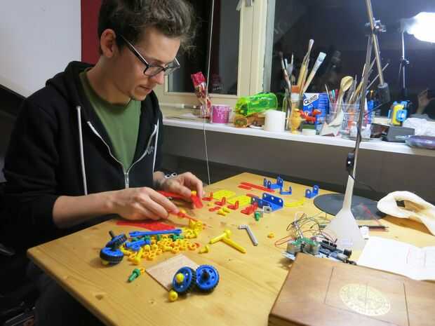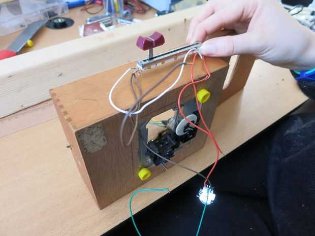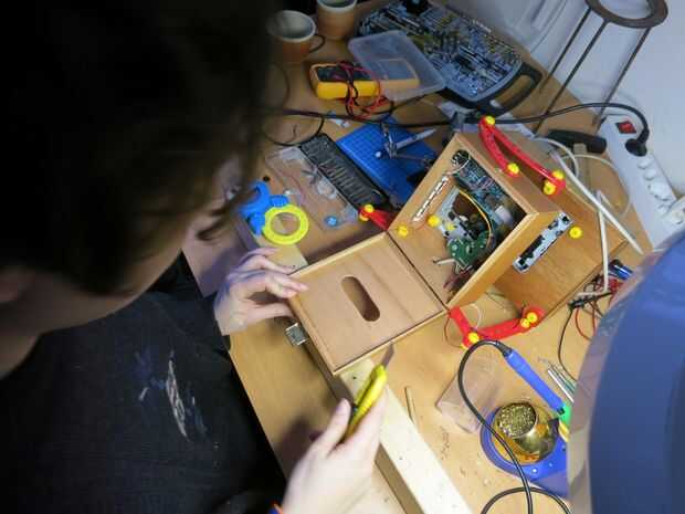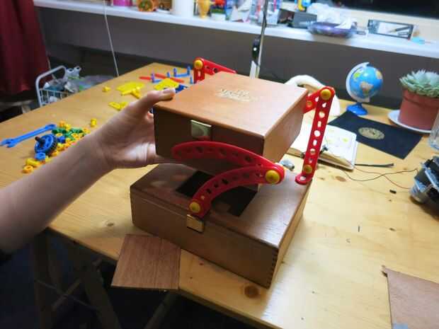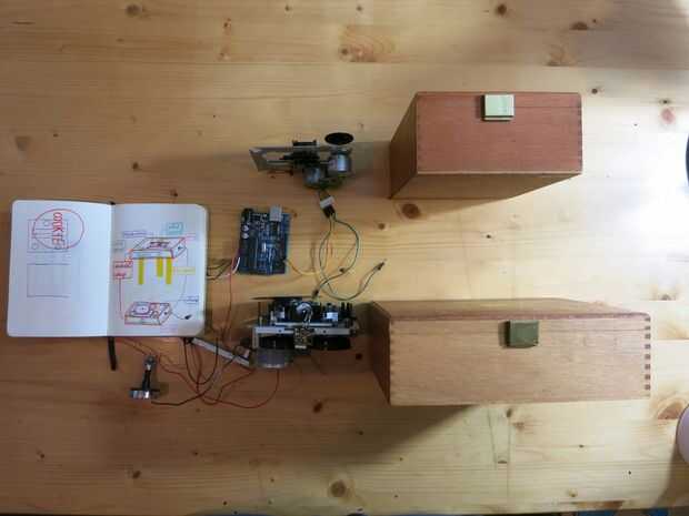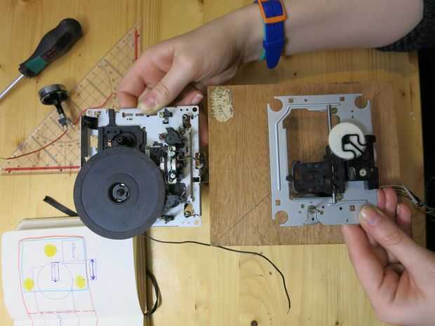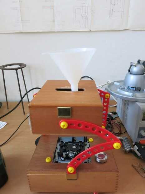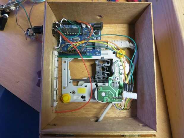 Siguiente paso es un montón de agujeros de perforación! Primero para fijar los componentes electrónicos, para unir los brazos y dejar que los cables a través. Un pequeño truco para la electrónica: si los tornillos son demasiado grandes para caber en los agujeros existentes pueden ser utilizados siempre como abrazaderas. Dispone de un conjunto de juguetes de construcción realizamos tres piernas articuladas. El cuadro inferior necesita tres agujeros para los brazos y la parte superior uno así. Asegúrese de probar antes de perforar por lo que es en el lugar correcto! Un agujero en la parte posterior de la caja superior libera el cable de alimentación o USB. También hacer que un pequeño agujero en cada caja será necesario para la electrónica de la parte inferior conectar al Arduino colocado en la parte superior. La parte del mecanismo de CD donde el objetivo era necesita ampliarse para poder montar el embudo de vidrio. También hacer una abertura en la caja superior para permitir el libre movimiento del embudo. Finalmente, si desea implementar controles como lo hicimos, se necesita abrir un espacio para ellos también.