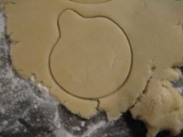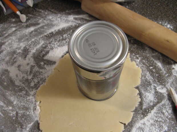 El rodillo a la masa un poco más gruesa que una galleta regular (aproximadamente 3/8 de pulgada) desea asegurar es lo suficientemente gruesa como para aplicar una sangría en el centro. Utilice su cortador de galletas de adorno para cortar tus galletas.