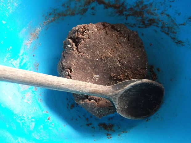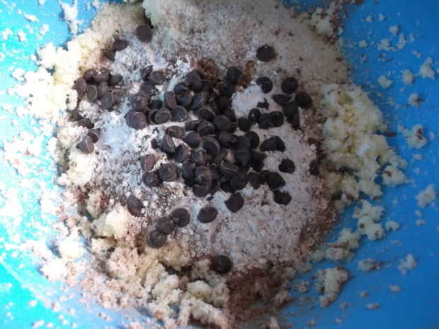 • Añadir la harina, molido de almendras, cacao, esencia de vainilla y chips de chocolate y mezclar bien hasta que se forme masa