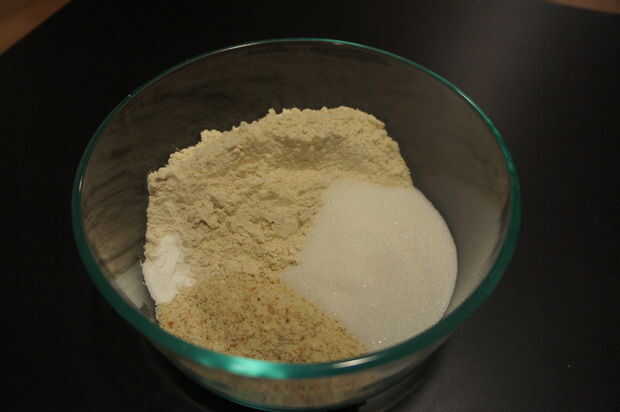 Mezclar todos los ingredientes secos en un bol (harina, azúcar, almendra machacada, polvo de hornear)