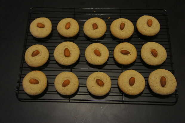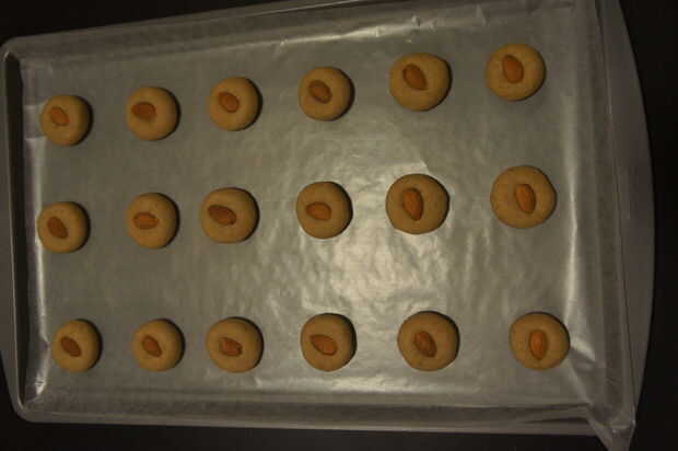 * Coloque las galletas sobre la bandeja y rodillo en bolas individuales y aplanar un poco. Decorar con una almendra en la parte superior
