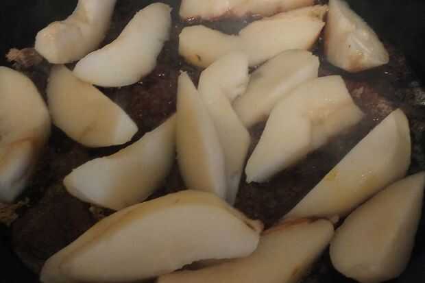 Caída de las peras y cocinar (aprox. 7 minutos) revolviendo suavemente a brown.