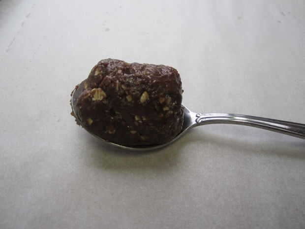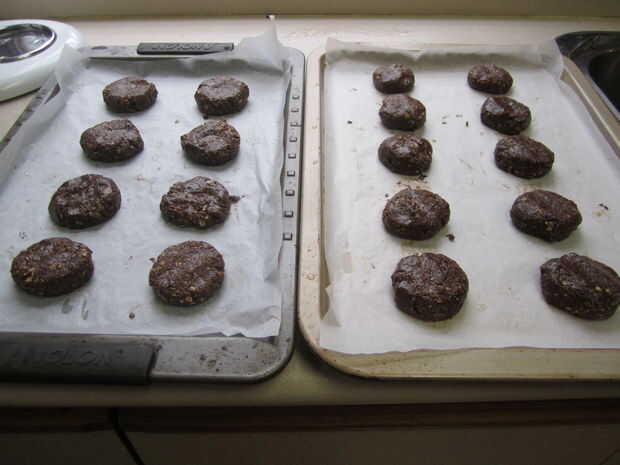 Cuando todos establecidos, aplane las bolitas con las manos mojadas hasta que la mezcla es aproximadamente de 1 centímetro de alto.