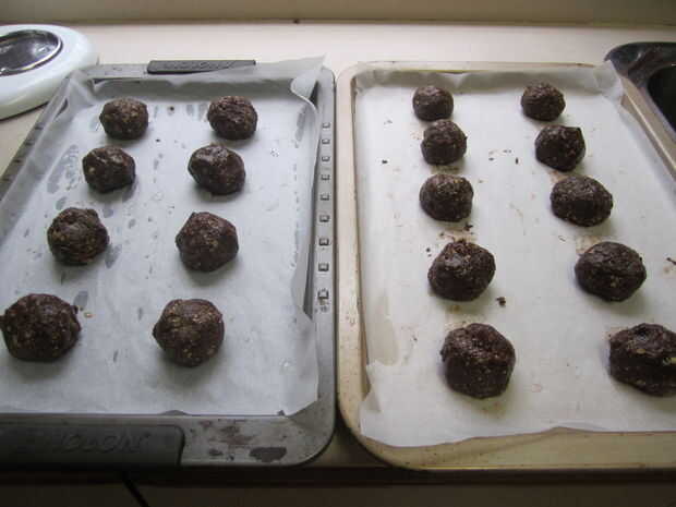 Utilice una cucharada y húmedo a mano alzada para rodar la mezcla bolitas y colocar sobre las bandejas.