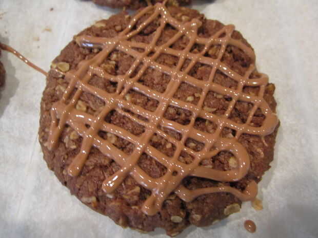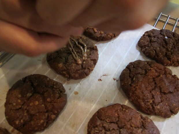Cuidadosamente tubo el chocolate derretido sobre las galletas, si quieres ser creativo.