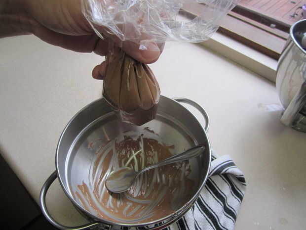 Cuidadosamente Vierta el chocolate derretido en una bolsa de plástico tolerantes al calor (zip lock bolsas son buenas) y luego cortar la esquina de la parte inferior de la bolsa. Asegúrese de que usted sólo hace un pequeño agujero en la bolsa.