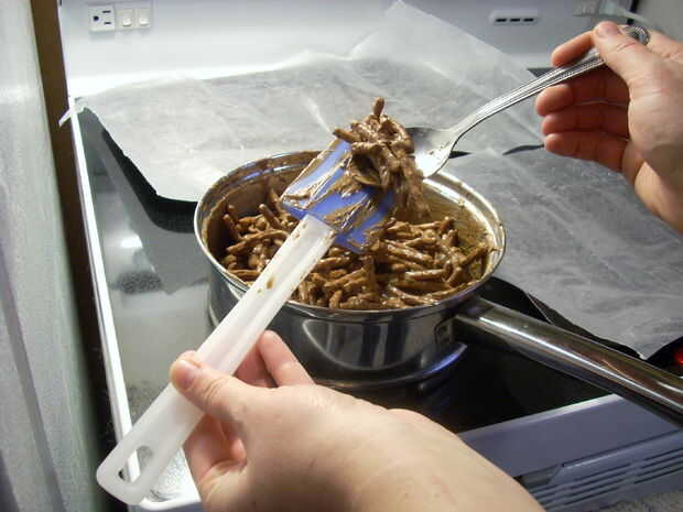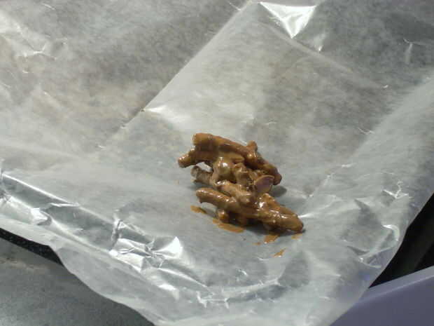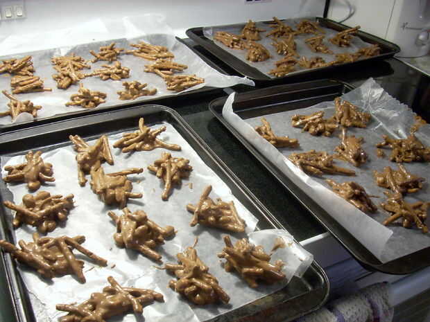 Usar cuchara y espátula, cuchara hacia fuera sobre galletas forrada de papel de cera. Pon hasta el sólido.