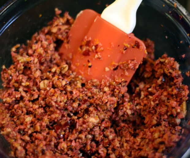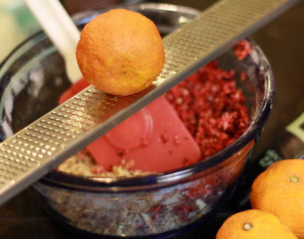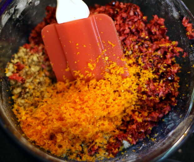Había pulsado las nueces y los arándanos (por separado) en mi cuisinarty ralladura de las naranjas con mi microplane. Desea identificables trozos de arándanos y nueces - no una pasta, o trozos de distractingly grandes.