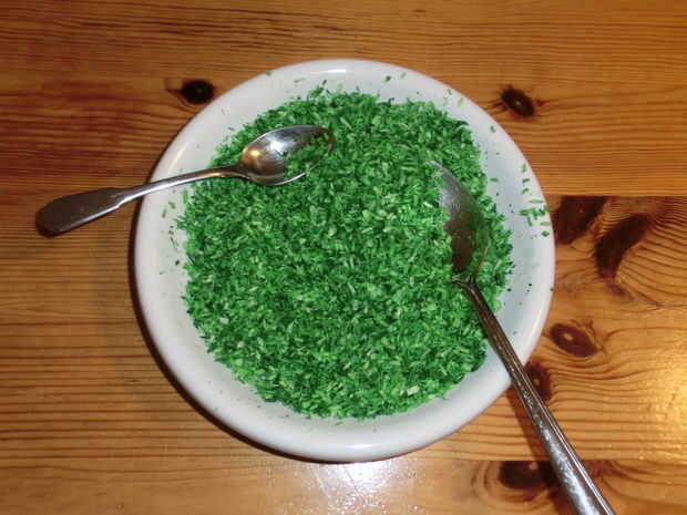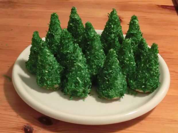 1. Para decorar sus árboles, mezclar el coco rallado con el colorante de alimentos verde. Hubiera podido añadir un poco de agua no deben mezclar bien.