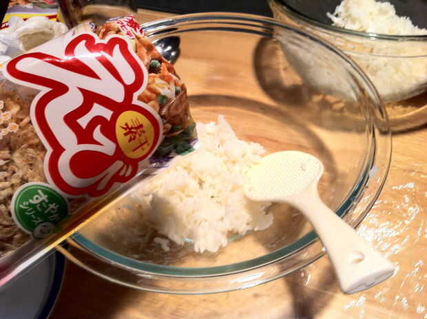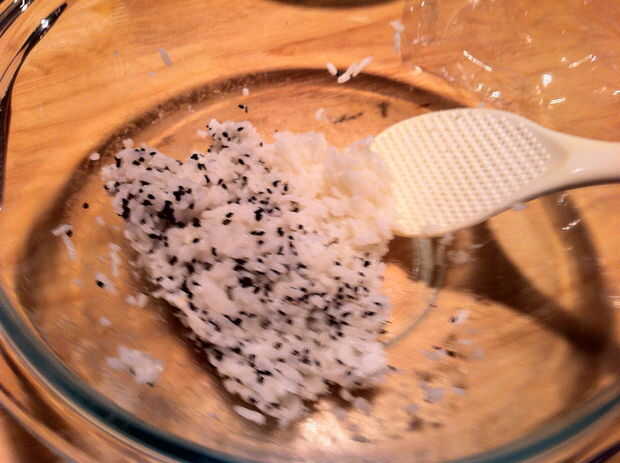 En primer lugar, añadir a su tazón de arroz de su sésamo semillas/camarón/lo que sea para darle sus galletas una buena cantidad de sabor (pero recuerda que a veces menos es más). Mezclar bien para que se distribuya uniformemente a lo largo de su arroz. Este paso también es importante porque le permite aplastar el arroz juntos un poco antes de que aplaste.