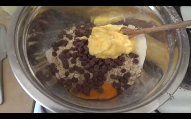 Esta receta es para unas galletas deliciosas manteca de cacahuete y avena-chocolate chip.Aquí es lo que necesitarás:blanco 1/2 taza de azúcar1/2 taza de azúcar morena1/2 taza de mantequilla3/4 taza manteca de cacahuete1-2 huevos (usar dos huevos si u