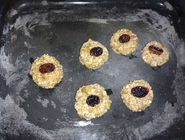 Colocar 1 cucharada por cada bocado de galleta en una bandeja para hornear. Coloqué una pasa encima de cada galleta.