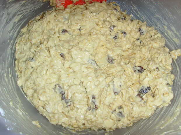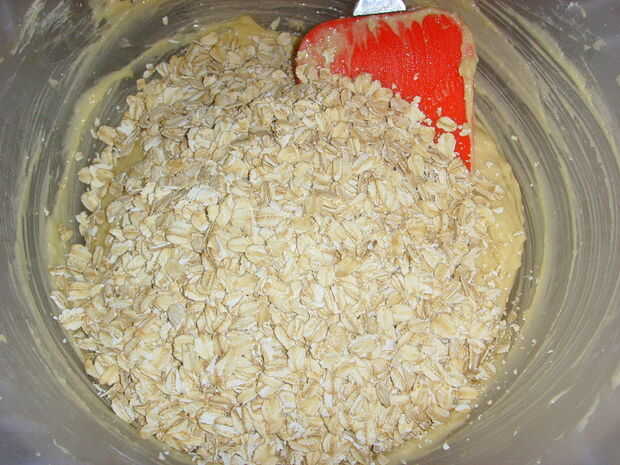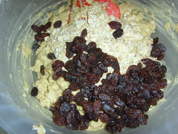 -Agregue la avena una taza a la vez, luego agregue las pasas.