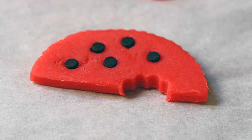 Añadir chips de chocolate mini 5-7, boca abajo, para que el lado plano de la viruta y el punto de la viruta en la cookie. Estas son las semillas negras de la sandía.
