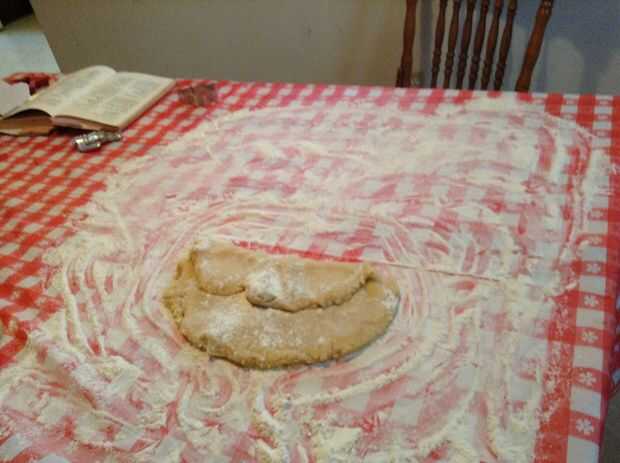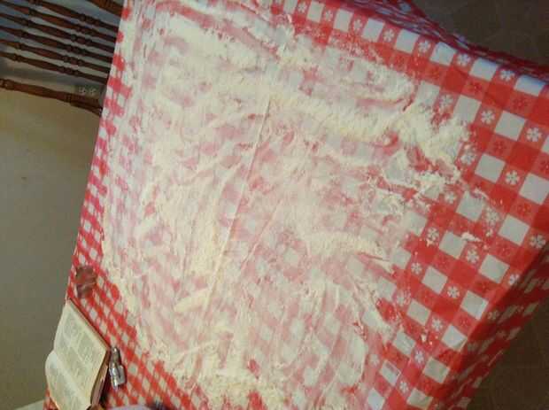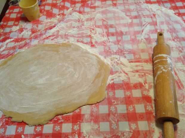 Una vez que la masa es espesa y fría, ir a la superficie se utiliza para estirar la masa y cubrir de harina. tomar dos puñados de la masa y estirar cubierta de harina.