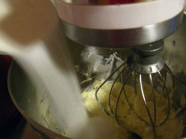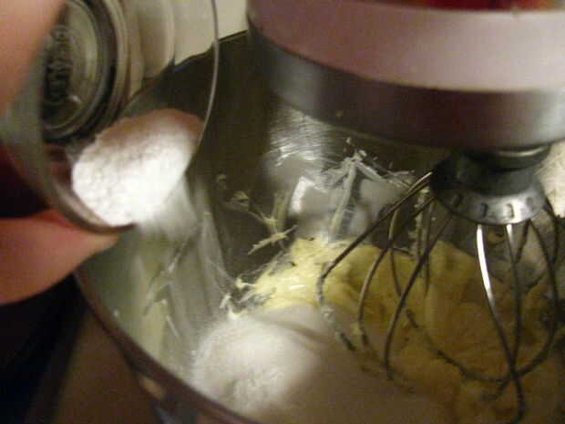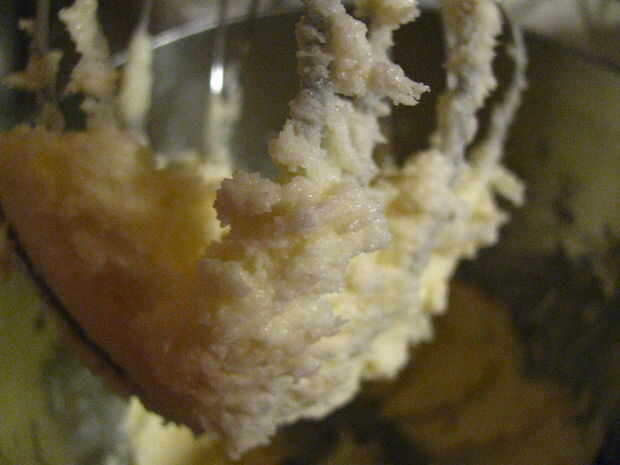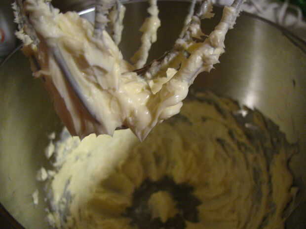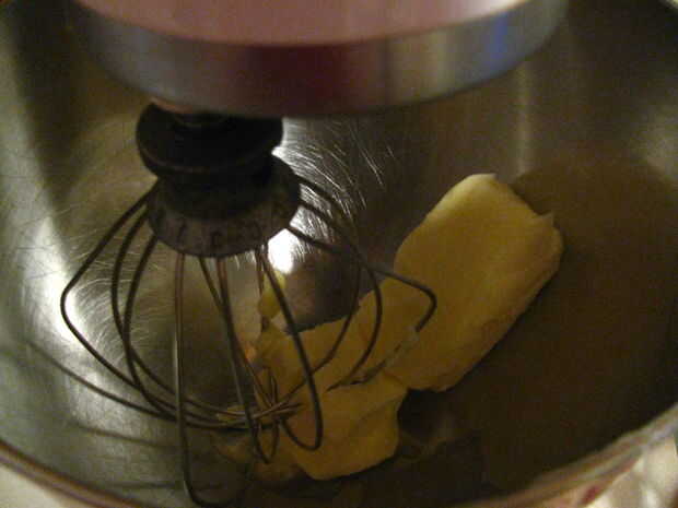 -2/3 tazas de mantequilla (Asegúrese de se ablande o se dañará su mezclador. Si usted está en un apuro puede descongelar la mantequilla en el microondas, pero estar muy atento; muchas veces he fundido accidentalmente la mantequilla, que puede cambiar la consistencia de la masa.)