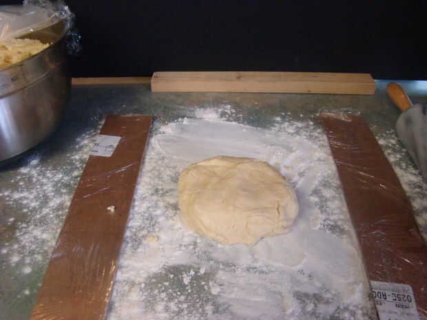 Estirar la masa 1/4 pulgada de espesor. Aquí es cómo hacerlo. Yo liberalmente espolvorear la encimera con harina. Puse las dos piezas de cartón (envuelto en plástico) en la harina con el espacio entre entonces, un poco menos ancho que el perno de balanceo. Agarra una mano llena de masa y volver a poner el resto en la nevera (mantener fría y va a necesitar menos harina para manejarlo). Hacer un arroz suave de la masa y cubrir con harina.