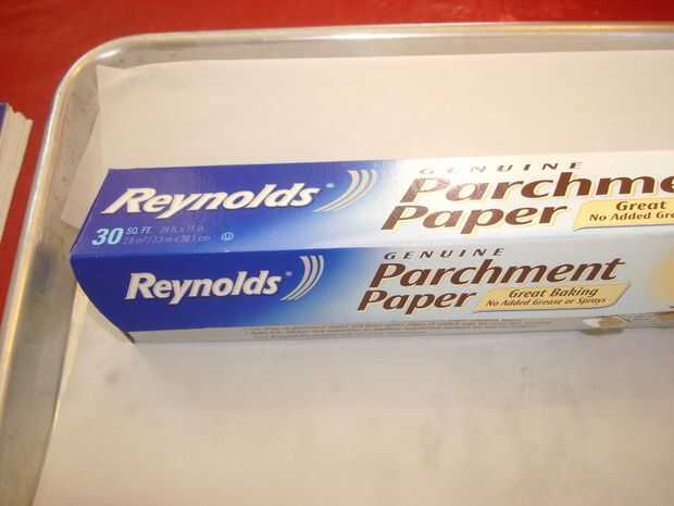 Línea de la bandeja para hornear galletas con papel de pergamino.