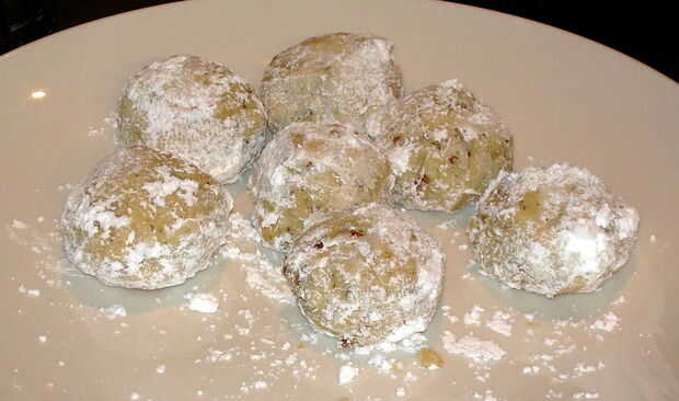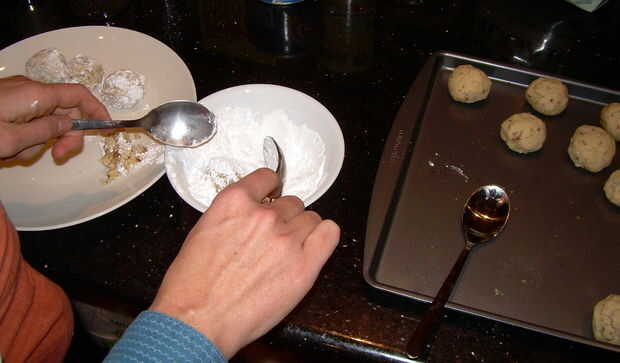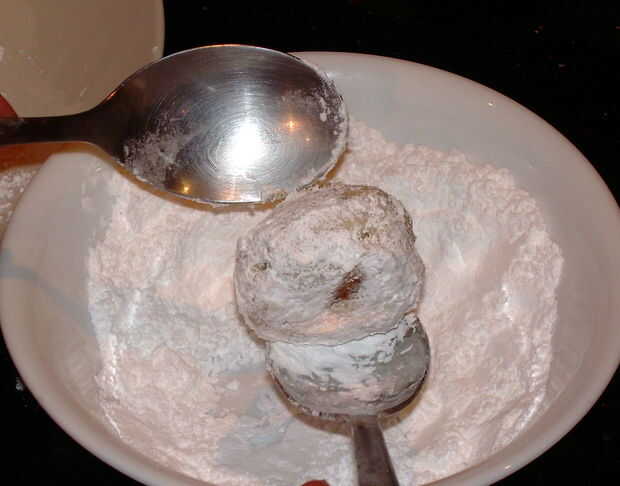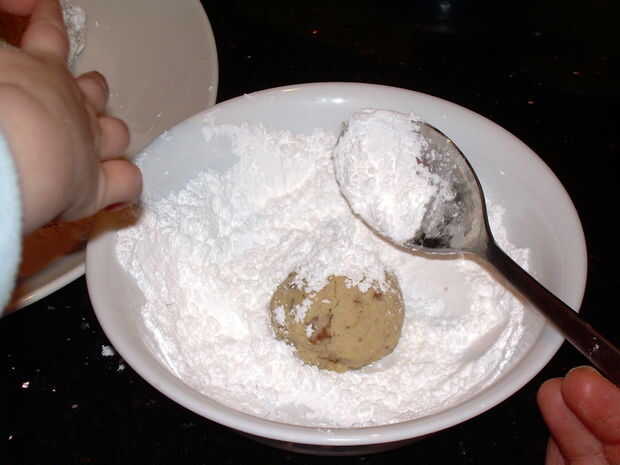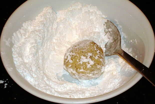 -Rodillo calientes galletas en azúcar en polvo para recubrir el exterior, a continuación, sentarse en un plato.