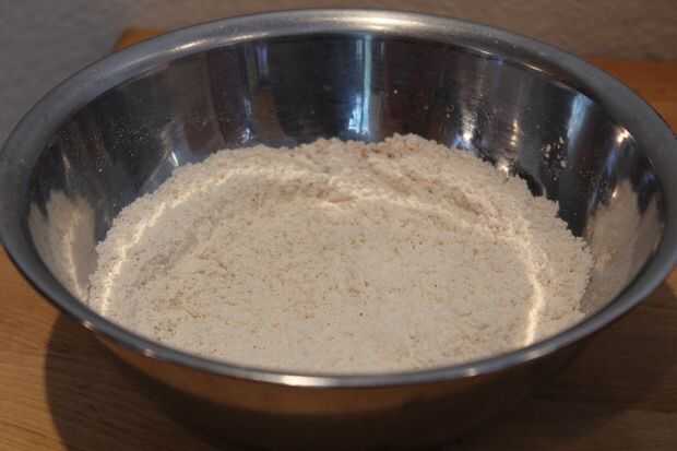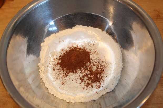 En un recipiente mediano, combinar los cinco primeros ingredientes en la lista: (harina, sal, nuez moscada, canela y bicarbonato de sodio).