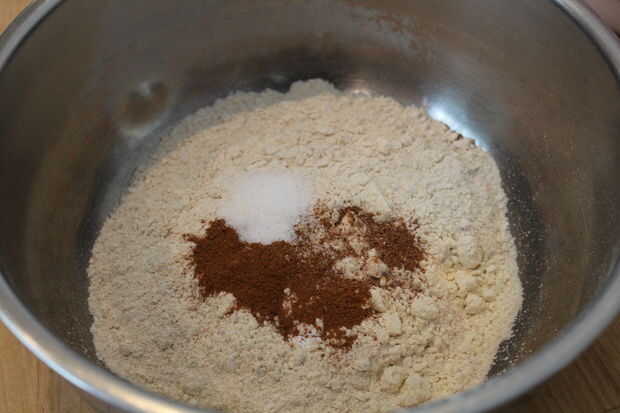 En un tazón mediano, cierna la harina, bicarbonato, sal, canela y nuez moscada.