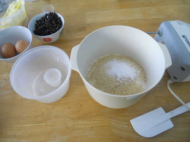Hacer un montón de cosas en tazas. Como esto!Paso 1: ingredientesAzúcar, panela, harina, sal, mantequilla, vainilla, aceite, huevos, trocitos de chocolate.Paso 2: medida1 cucharada de mantequilla, 1 cucharada azúcar, 1 cucharada de azúcar morena, spl