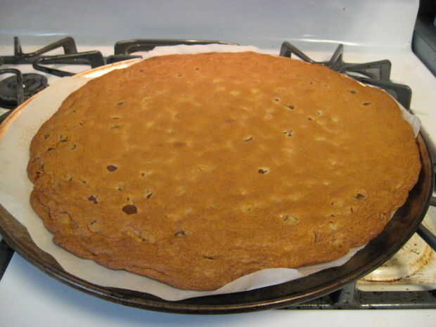 Galleta con chispas de Chocolate gigante!Hace suficiente masa para galleta de tamaño de pan de pizza de 32 pulgadas más un adicional galletas de tamaño normal de 3 docenas o 6 o 7 docenas de galletas normales. Esta receta es fácilmente escalable a la