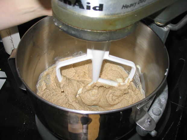 Crema de dos palos de temperatura de la mantequilla sin sal con una buena cantidad (aproximadamente 1.5 c) de azúcar morena. Un mezclador es bueno, pero también funciona una cuchara de madera.