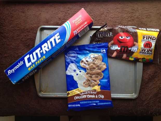 Todo lo que necesitas es la masa de las galletas de chispas de Chocolate, pan, papel de cera, M & M y un horno!