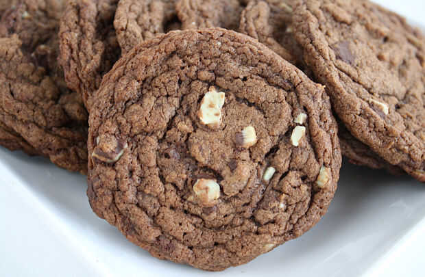 soy un gran fan de la combinación de chocolate/menta, que por eso me encanta poner Andes crema de menta chips en esta receta de cocción, pero la receta de galleta de chocolate es increible no importa lo que pones en él! He utilizado trocitos de chocolate, chips de mantequilla de maní, chips de chocolate blanco, etc., y todas resultan de gran! Esta receta de galletas de chocolate particular es mi favorito porque utiliza chocolate derretido en vez de cacao en polvo y creo que hace una gran diferencia en el sabor de las galletas!