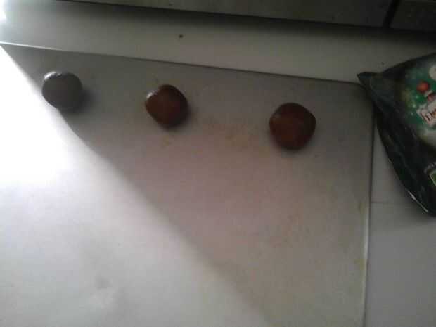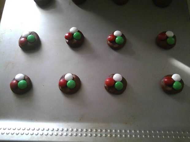 Si usted planea usar la menta de los Andes, deja las bolas como es. Si vas a utilizar los M & Ms, utilice sus dedos para aplanar un poco las bolas. Luego coloque tres M & Ms en cada uno. Hornear las galletas 10-12 minutos.