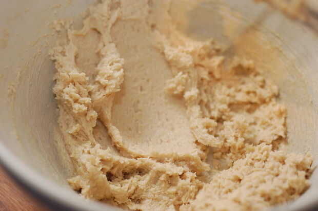 Crema juntos la mantequilla y el azúcar durante unos minutos, hasta que el color se ha aligerado y como un café con leche. (unos 3 minutos con un batidor eléctrico debe hacerlo).