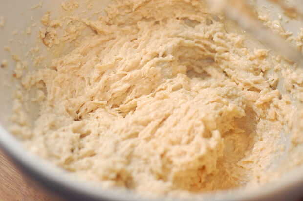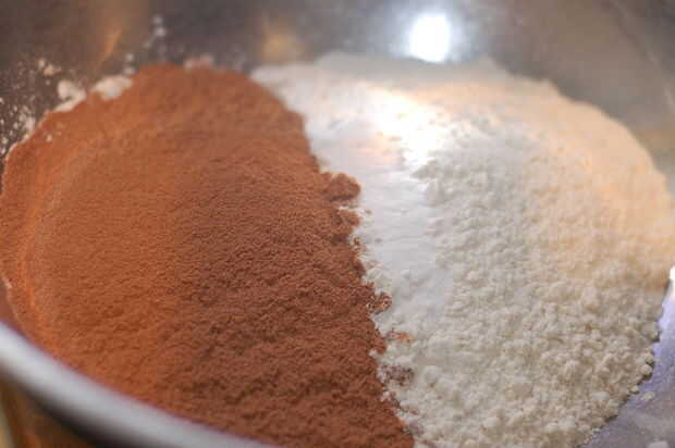 Ahora añadir la harina, ovaltine, sal y polvo de hornear. Bata todo bien durante unos segundos. No hay que batir por mucho tiempo.