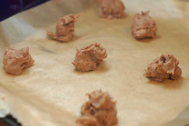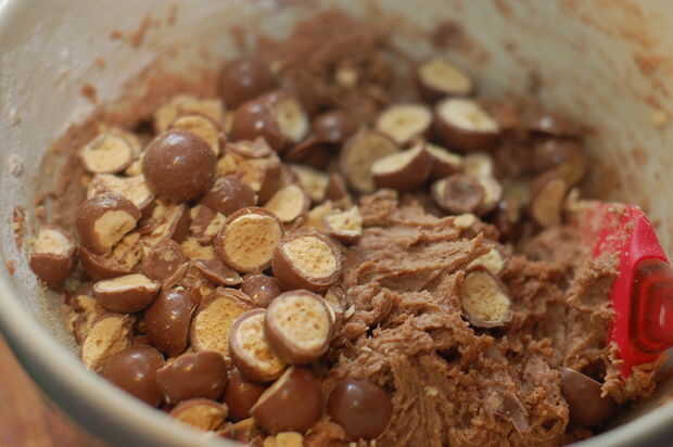 Revolver a través de su malteasers picado o bichos con una cuchara o espátula. entonces cucharada cucharadas soperas de la mezcla en las hojas para hornear. Asegúrese de que dejas un montón de espacio entre cada galleta como estas propagación hacia fuera mucho.