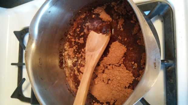 En una cacerola, a fuego lento, derretir la manteca de palos 2. (No usar margarina) Agregue 1/2 taza cacao en polvo. Dejar de lado que se enfríe.