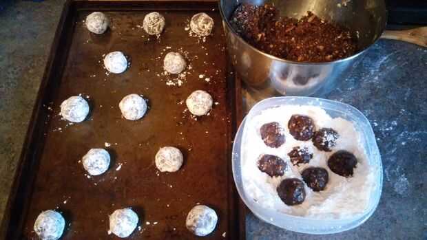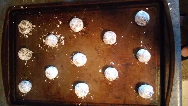 Rodar una bola de masa del tamaño de una nuez, capa de azúcar en polvo y coloque en la hoja de galleta., presionando ligeramente para que no ruede alrededor.