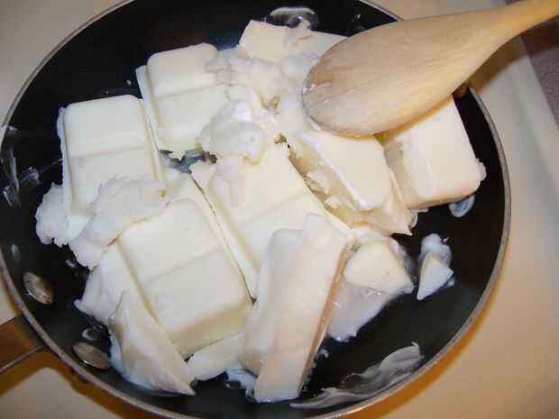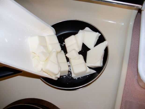 La vainilla se romperá en varios pedazos y coloque en la bandeja. He descubierto que este material tiene una tendencia a secarse y también derrite irregularmente, pero esto puede ser remediado simple cayendo 2-3 cucharadas de aceite de coco en el pan con él. Revolver varias veces, al igual que con el chocolate hasta que en su mayoría es liso, nunca consigue 100%.